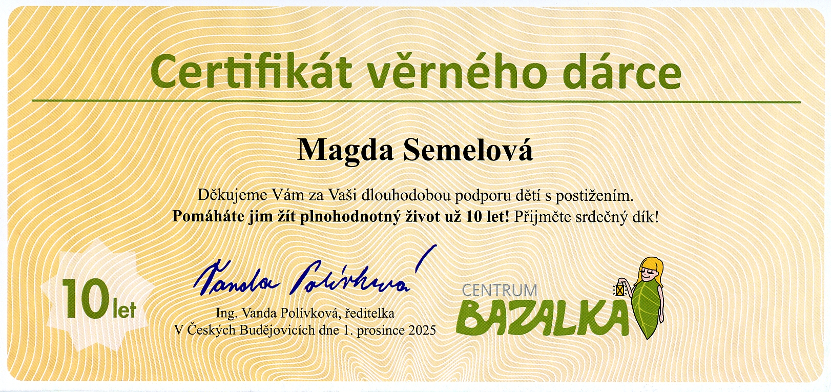 Přispět alespoň maličkým dílem na dobrou věc je pro mě velká radost a činí to můj život šťastnějším a naplněnějším. A u dětí s postižením to platí dvojnásob. Mají můj velký obdiv - Bazalka